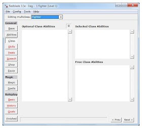Skill selection is a breeze. There is a drop down box for class and Class skills and Cross Class skills. The software tabulates points to Class and Cross Class skills. The initial selection occurs on the center screen and more ranks are added on the right with the arrow buttons.